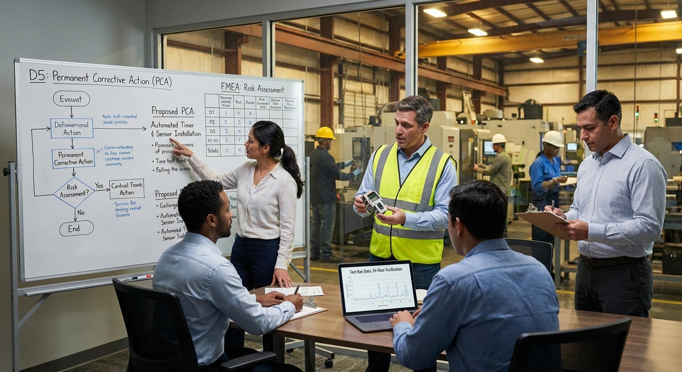 8D8D discipline where the team selects the best Permanent Corrective Action (PCA) to eliminate root causes identified in D4. Must address both the creation cause (why defect occurred) and escape point (why it wasn't detected). Solutions are tested on small scale before full implementation to verify effectiveness without creating new problems. Uses risk assessment (FMEA) to evaluate potential unintended consequences. Similar to A3 Countermeasures but with more explicit verification requirements before rollout.