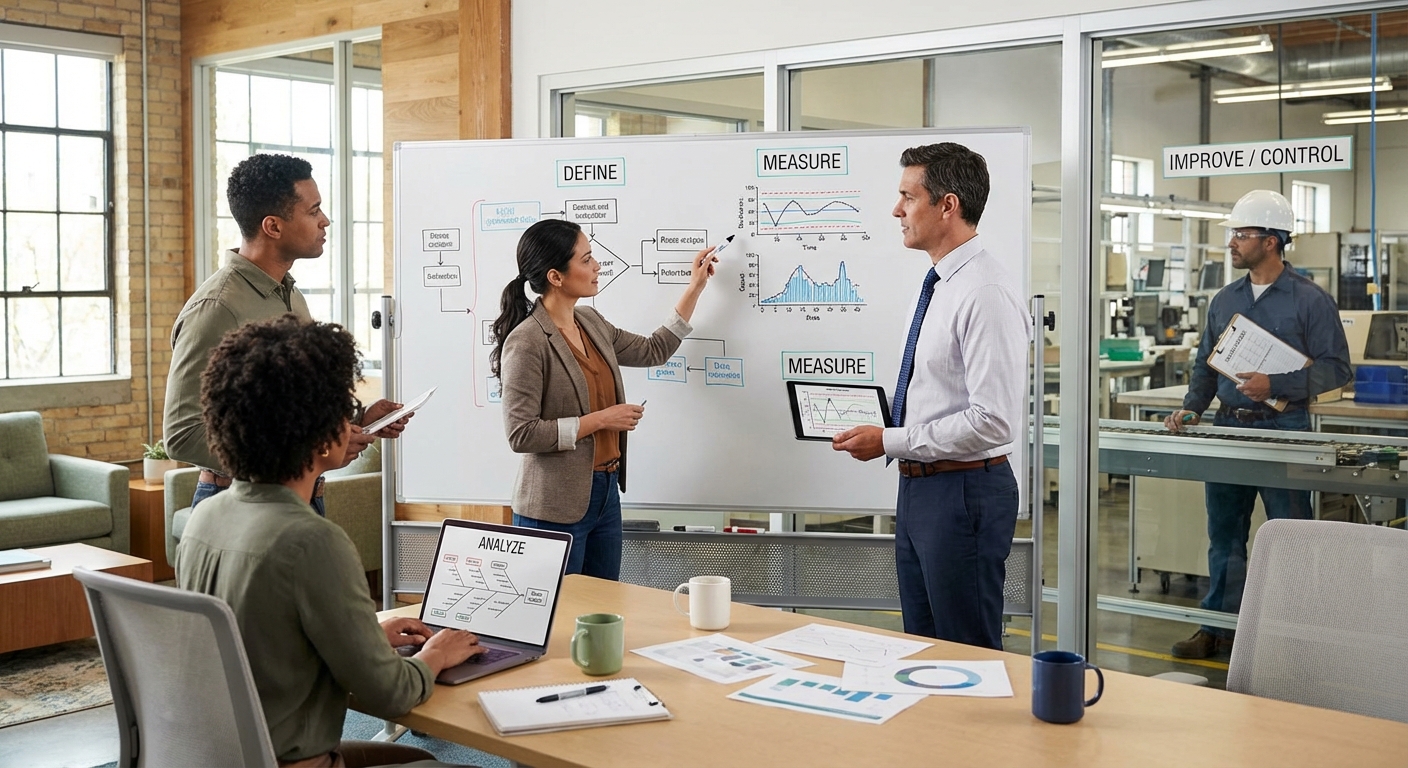 Six SigmaFive-phase problem-solving methodology used in Six Sigma: Define the problem, Measure current performance, Analyze root causes, Improve the process, and Control to sustain results. Similar to PDCA but with more emphasis on statistical rigor and data-driven decision-making. Typically used for complex process improvement requiring weeks or months.