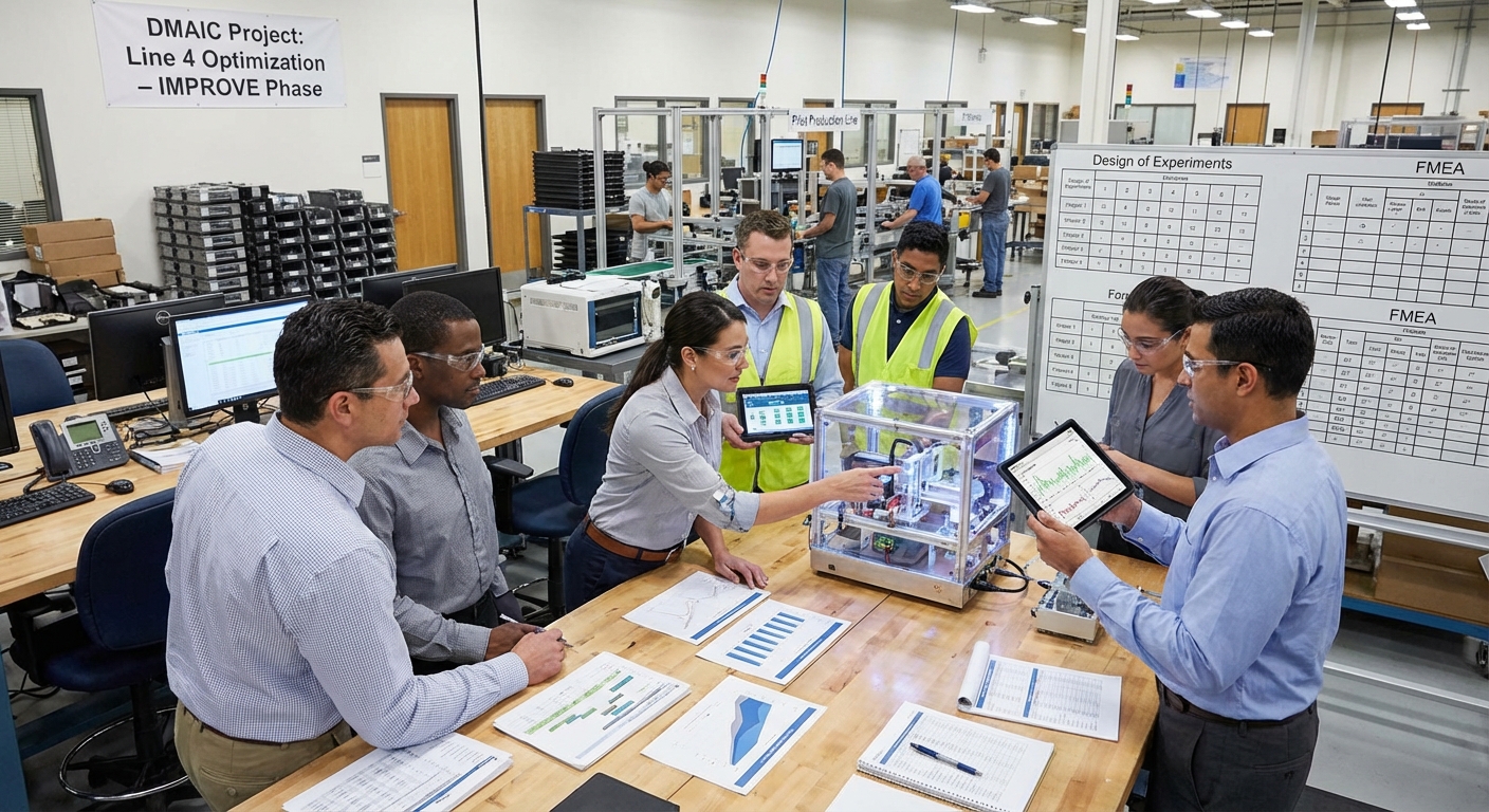 Six SigmaFourth phase of Six Sigma DMAIC where solutions are developed, tested, and implemented to address verified root causes. May use Design of Experiments (DOE) to optimize multiple factors simultaneously. Solutions are piloted on small scale before full deployment to minimize risk. Includes cost-benefit analysis and risk assessment (FMEA). Answers 'What changes will eliminate the root causes?' Similar to A3 Countermeasures and Implementation Plan but with more rigorous experimentation and validation requirements before rollout.