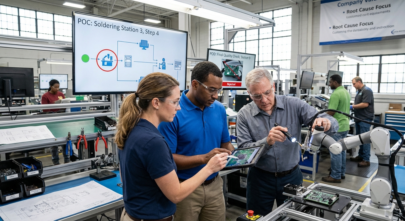 Root CauseThe specific location, process step, or moment in time where a defect or problem is actually created or introduced. Also called Point of Occurrence (POO). Different from Point of Detection (POD) where the problem is discovered, and Escape Point where it should have been caught. Understanding POC is essential for effective root cause analysis—fixing detection points prevents escapes but doesn't eliminate the problem at its source. Example: defect created during welding (POC) but discovered during final inspection (POD). Root cause analysis must trace back to POC to implement permanent corrective actions.