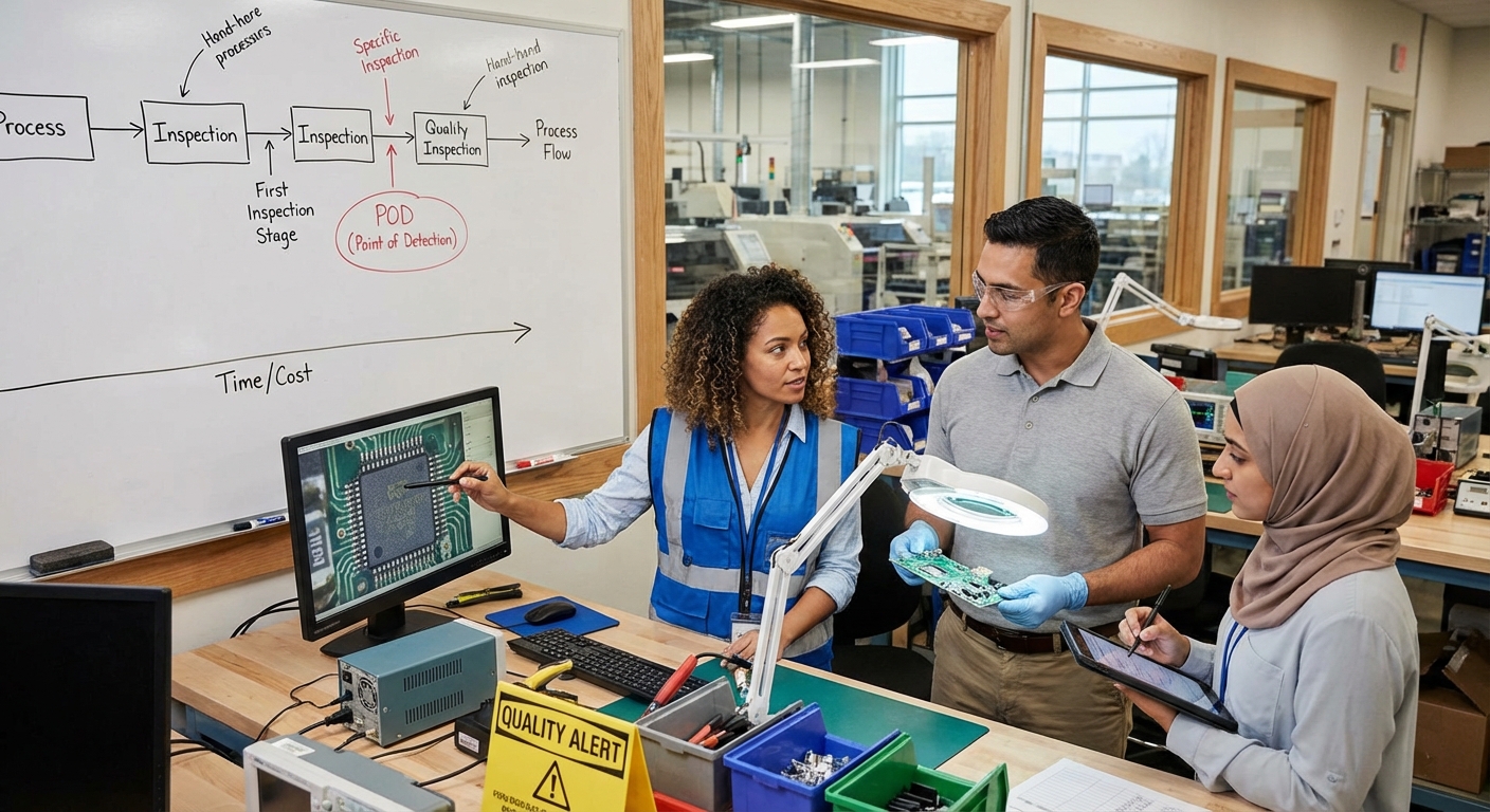 Root CauseThe location, process step, or moment in time where a defect or problem is first discovered or identified. Different from Point of Cause (POC) where the problem originates. The gap between POC and POD represents opportunity for improvement—the longer the gap, the more costly the problem becomes. Ideally, POD should be as close as possible to POC through in-process inspection, mistake-proofing, or real-time monitoring. Used in root cause analysis to understand why problems escape detection. Related to Escape Point concept in 8D which asks why existing detection methods failed.